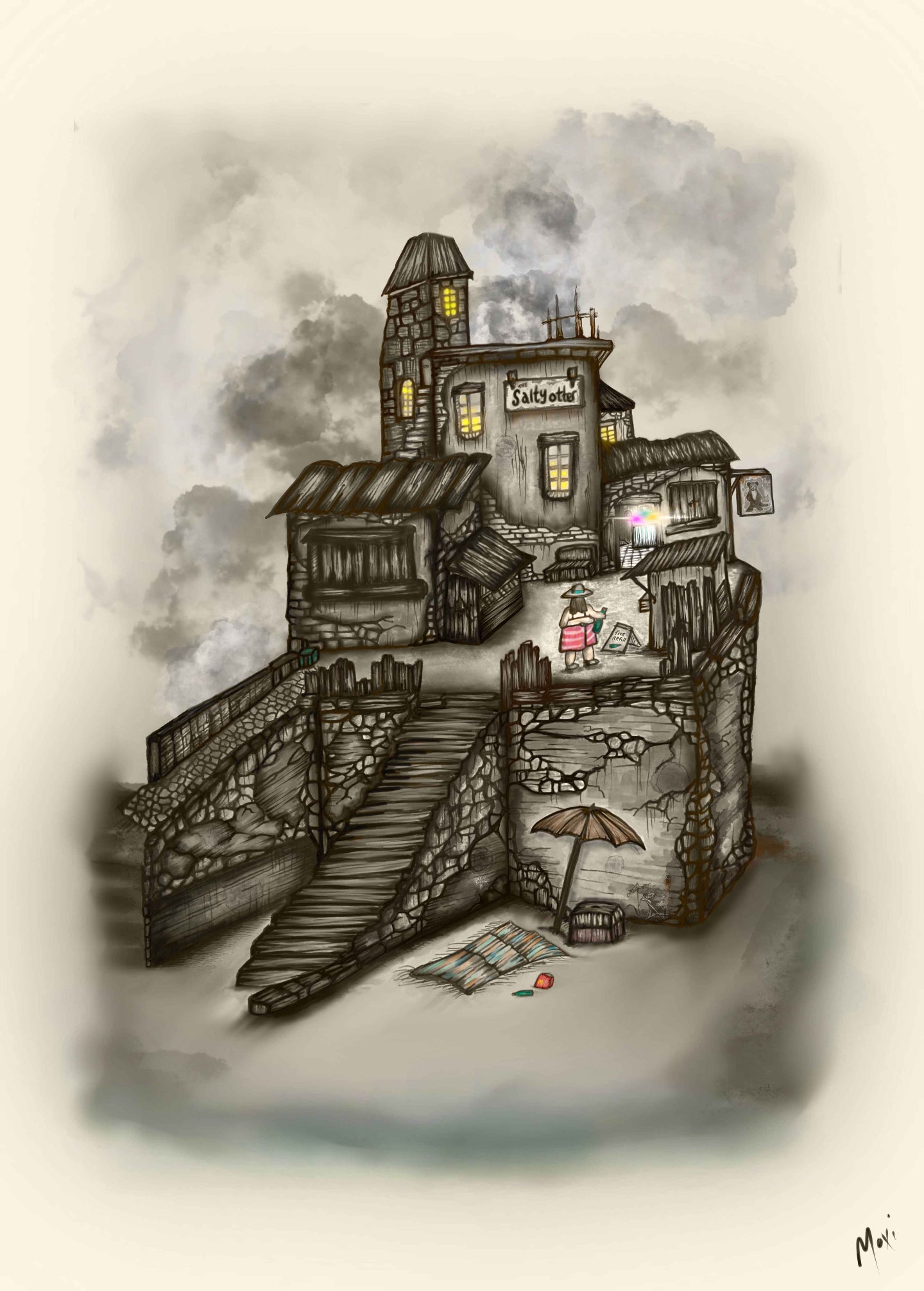 Friday Night at the Salty Otter | Line Drawing Print Pub On The Beach | Surreal Sketchwork