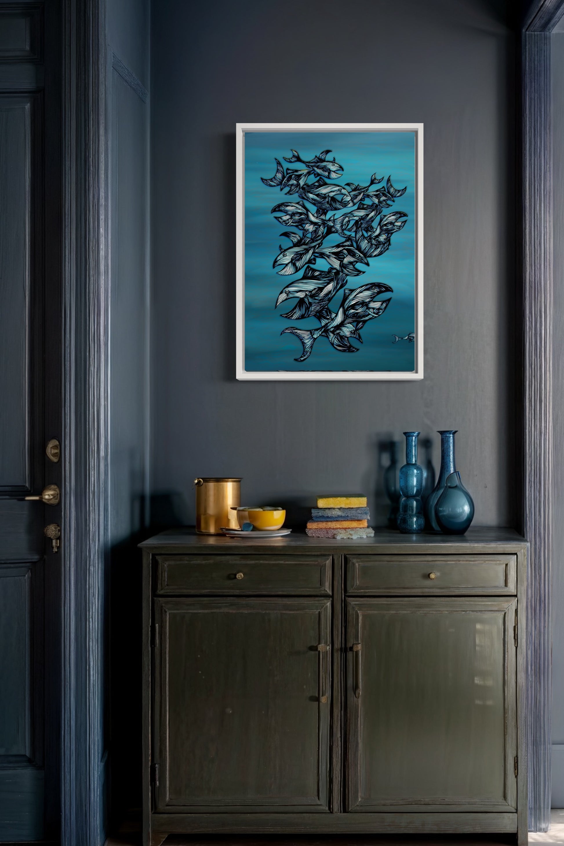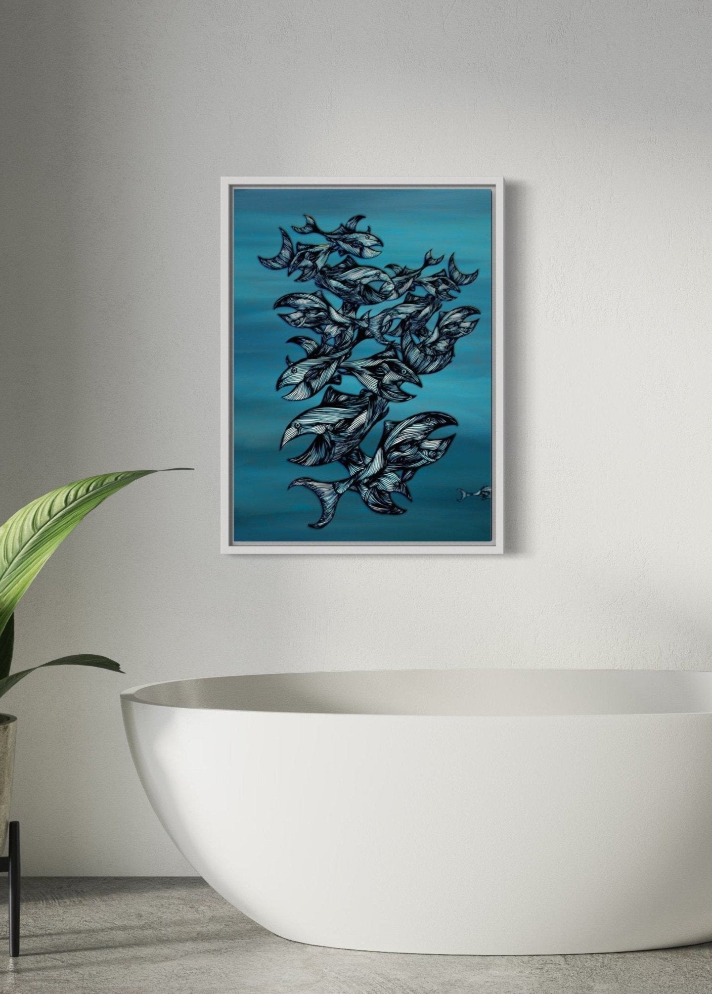 Alpha Tuna leads the way. A line drawing with digitally blended colours for background. A bathroom print with character.