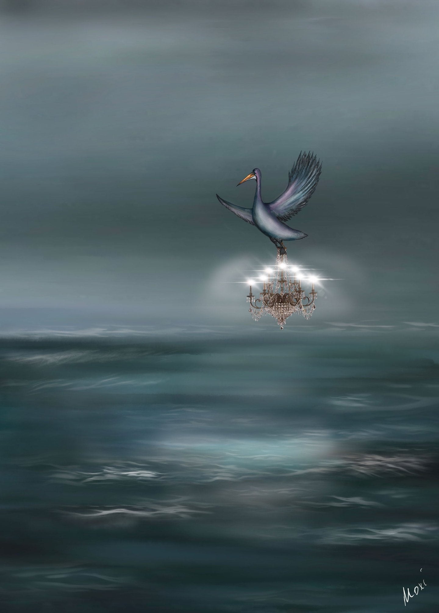 The original Pelican Chandelier Delivery artwork that inspired other printed items in the Moxi shop.