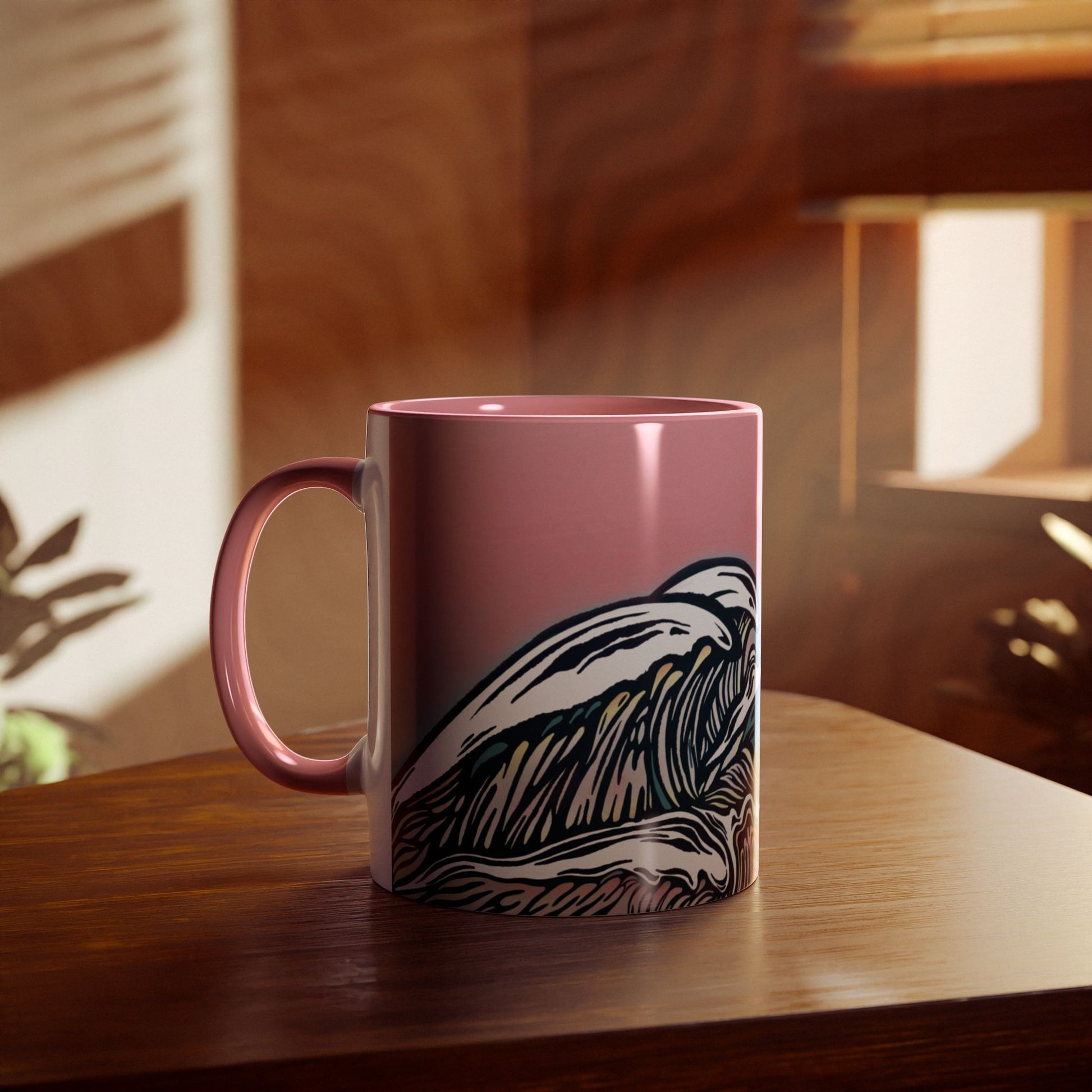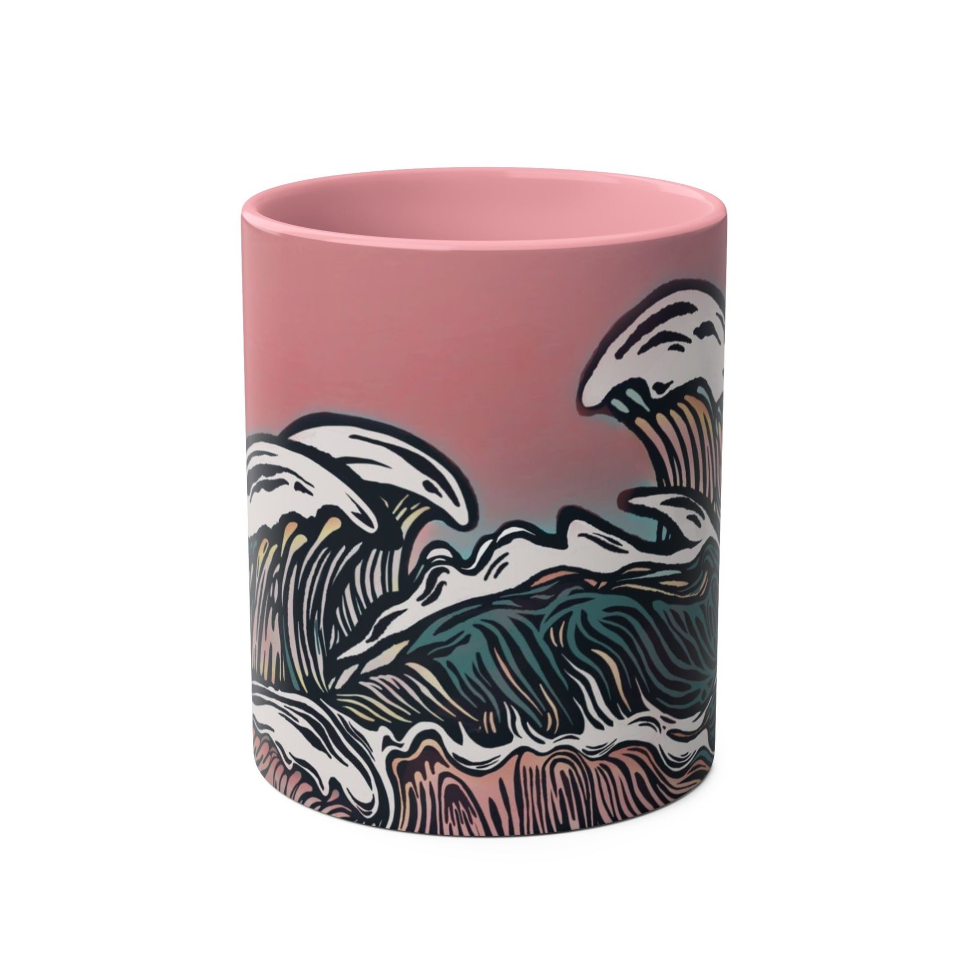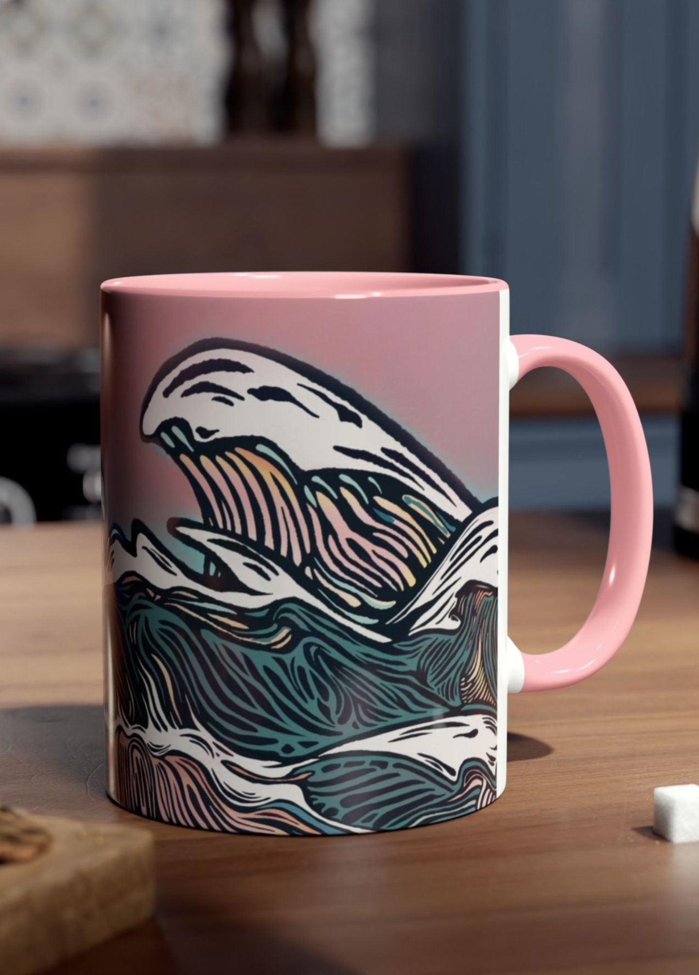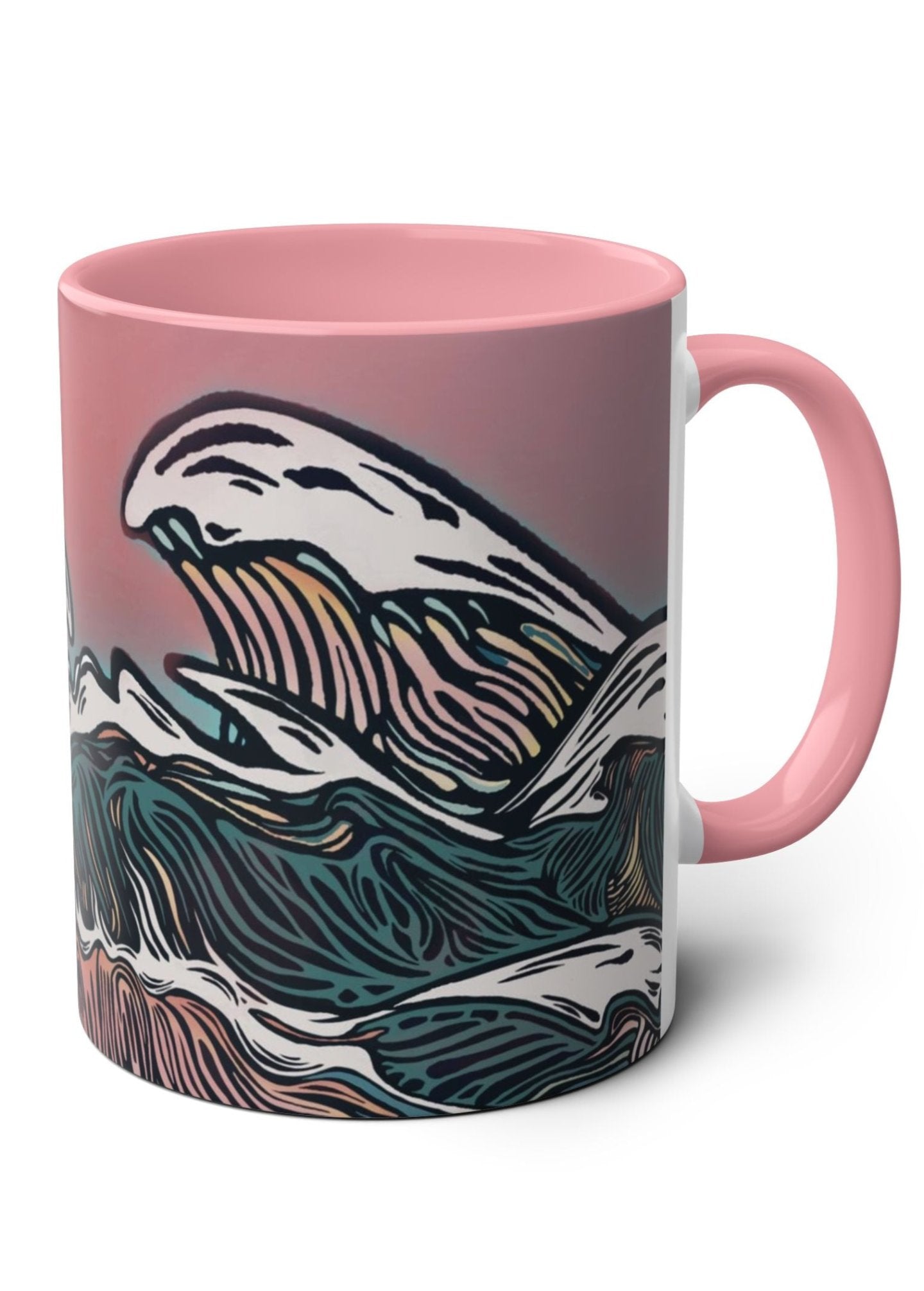 The woodcut-style wave design against a pastel pink sunset