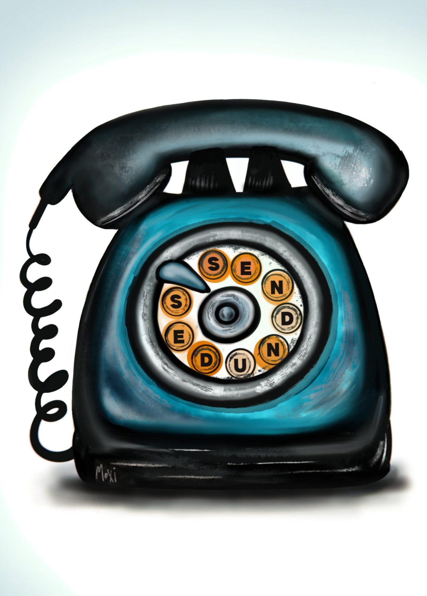 Retro flirting, 1980's landline style. Only those who get close enough with an eye for detail will get the hidden message in the dial of this hand drawn Moxi design.