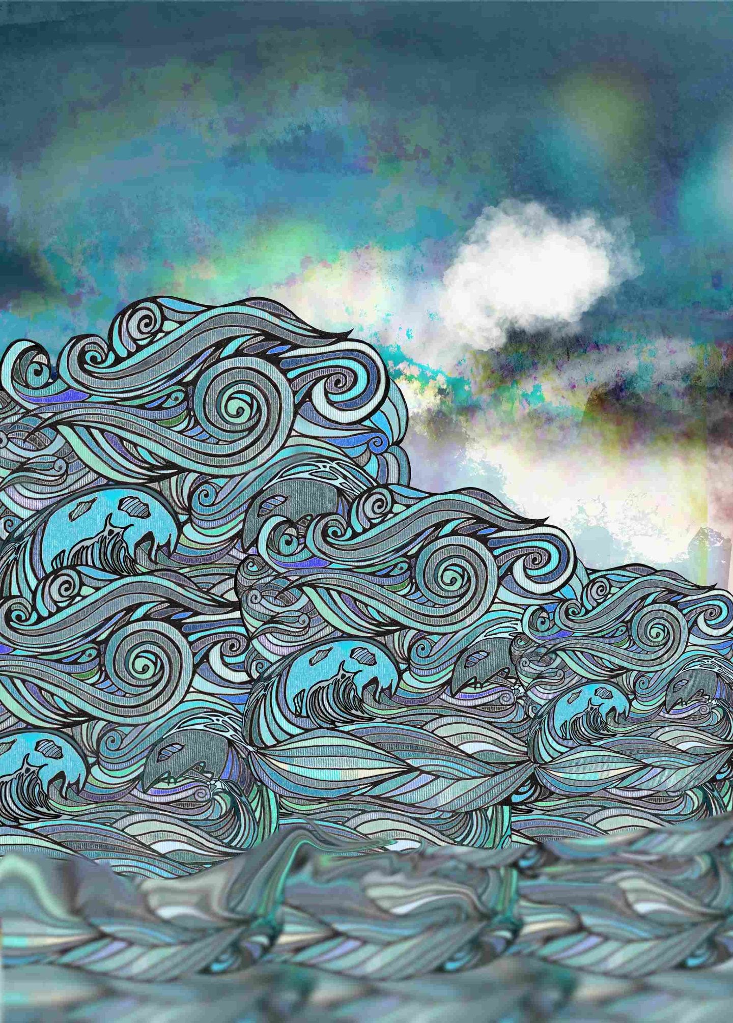 This vibrant ocean scene is a collage of line work against a digitally distorted background.